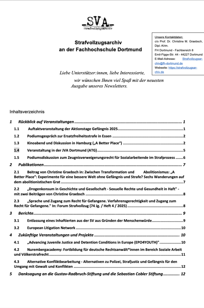 Wir freuen uns, unseren aktuellen Newsletter mit Rückblicken auf vergangene Veranstaltungen, Hinweisen auf aktuelle Publikationen sowie zukünftiger Projekte und einem besonderen Dank an die Gustav-Radbruch-Stiftung und die Sebastian Cobler Stiftung zu veröffentlichen.