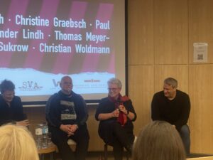 Alexander Lindh konnte uns krankheitsbedingt nur per Videoschalte über die Entwicklung der Serie A BETTER PLACE erzählen, danke dafür! Ebenso großer Dank gebührt den Panelteilnehmenden vor Ort, Christine Graebsch, Martin Eibach, Thomas Meyer-Falk und Christian Woldmann für ihre Bereitschaft, sich auch unbequemen Fragen zu stellen und sehr offen aus ihren jeweiligen Berufs- und Erfahrungsfeldern zu berichten.